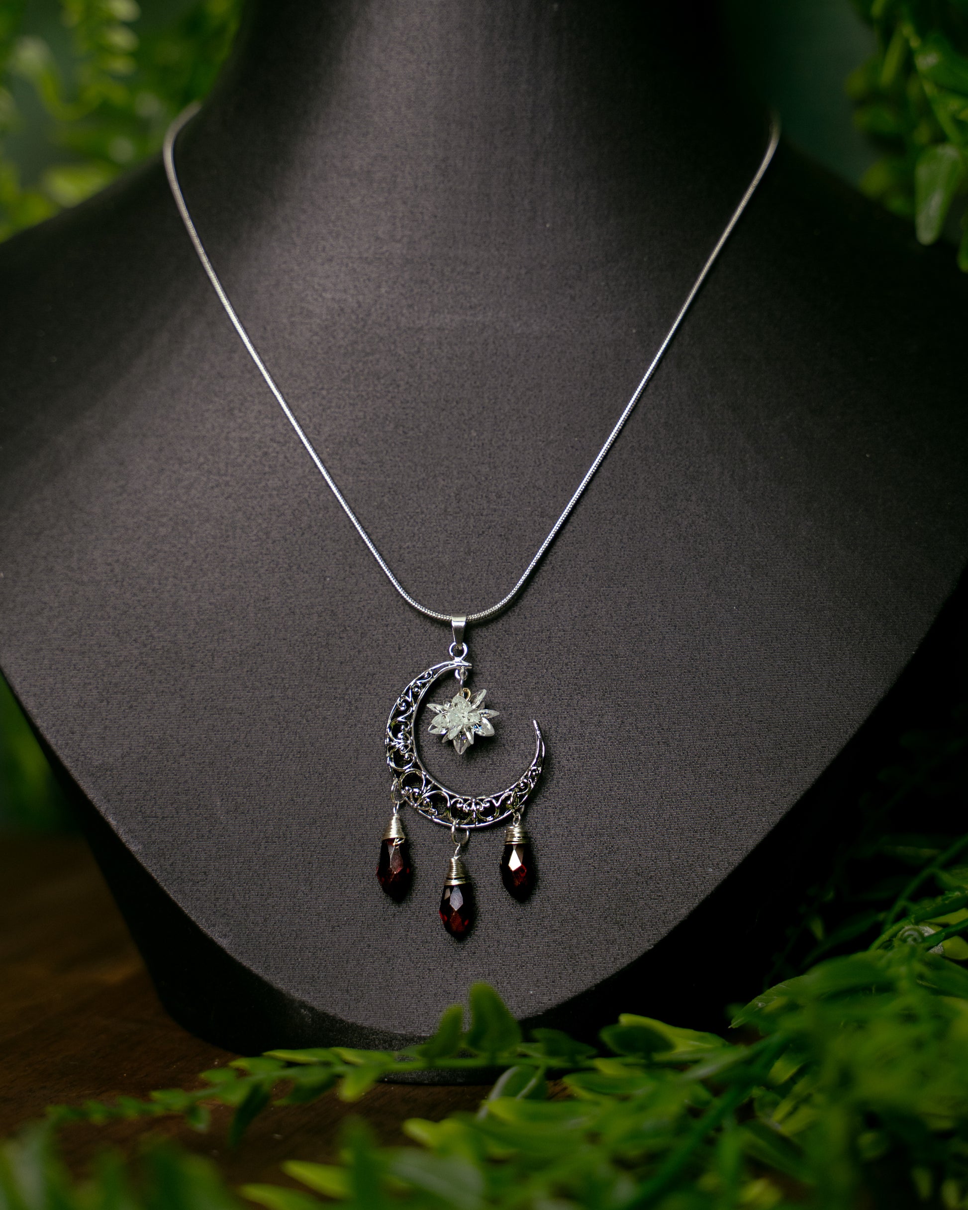 Das Zusammenspiel aus zartem Metall, himmlischem Stern und leuchtenden Tropfen verleiht dem Schmuckstück eine besondere Tiefe und eine fast märchenhafte Ausstrahlung.